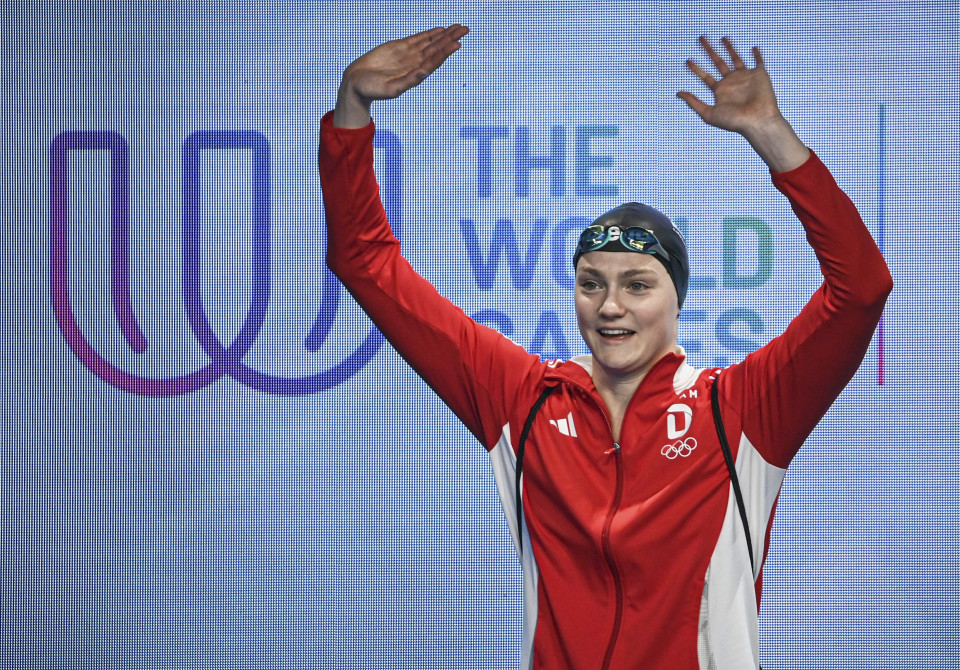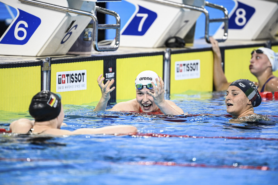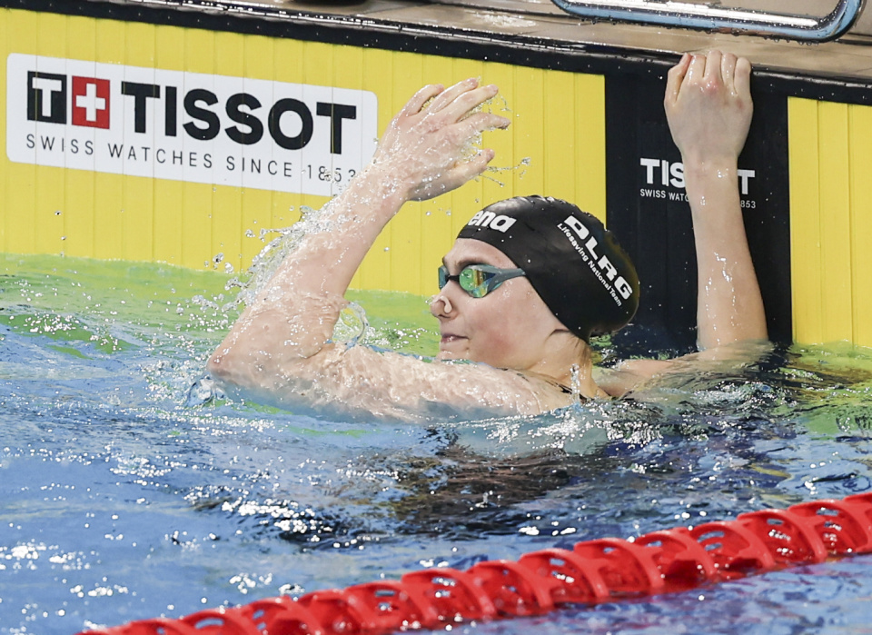 8月8日,德国选手霍尔特在比赛后。最终,她以1分03秒69的成绩获得冠军并创造了该项目新的世界纪录。新华社记者 张丽芸 摄