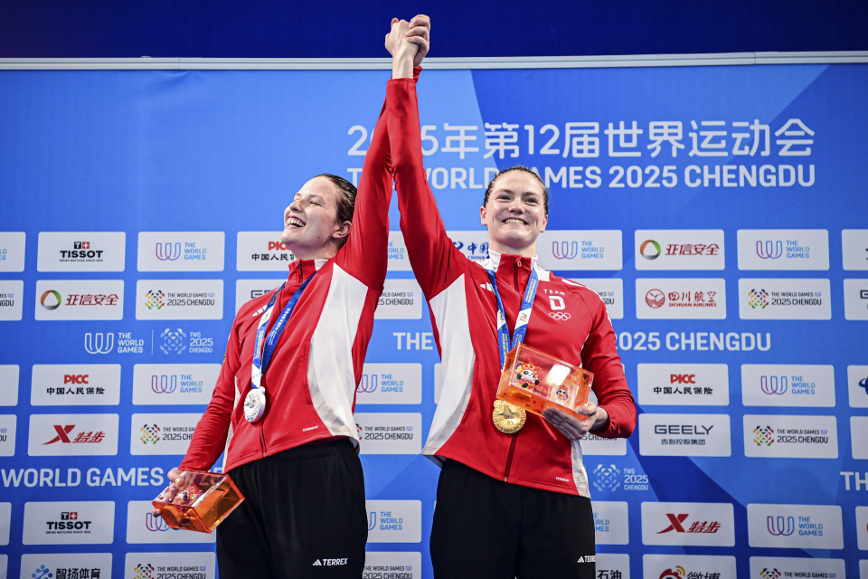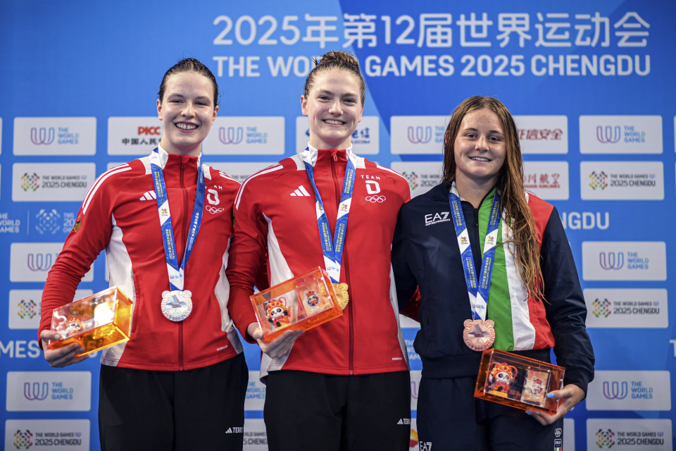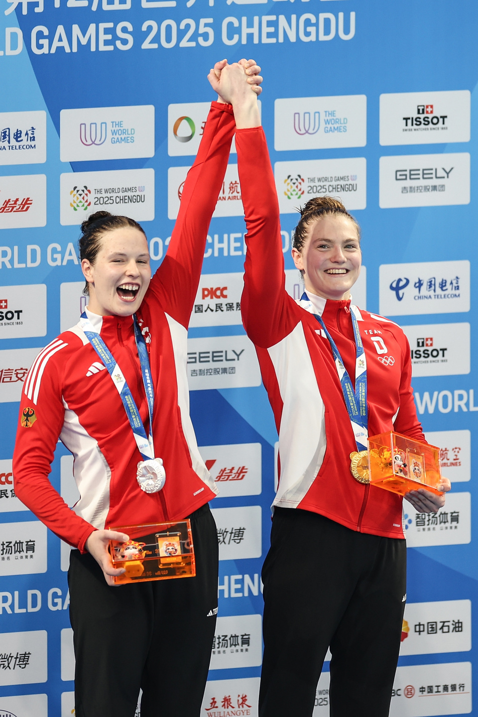 当日,成都世运会女子100米混合救生决赛在成都体育学院三岔湖校区游泳馆举行。8月8日,德国选手奥珀曼(左二)在赛后与队友霍尔特(左一)庆祝。最终,霍尔特以1分03秒69的成绩获得冠军并创造了该项目新的世界纪录,奥珀曼获得亚军。新华社记者 江汉 摄