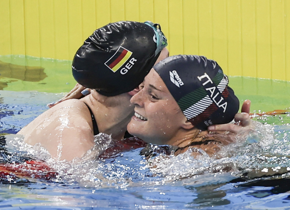 8月8日,德国选手霍尔特(左)和意大利选手皮罗瓦诺在比赛后拥抱。最终,霍尔特以1分03秒69的成绩获得冠军并创造了该项目新的世界纪录,皮罗瓦诺获得第七名。新华社记者 张丽芸 摄