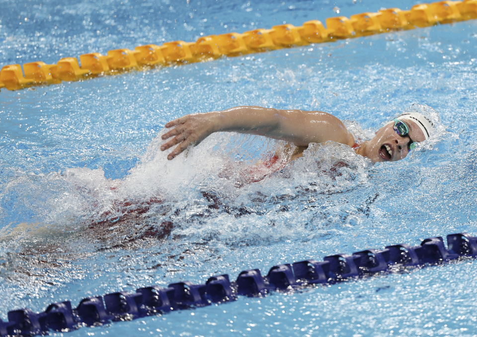 8月8日,德国选手霍尔特在比赛前。最终,她以1分03秒69的成绩获得冠军并创造了该项目新的世界纪录。新华社记者 江汉 摄
